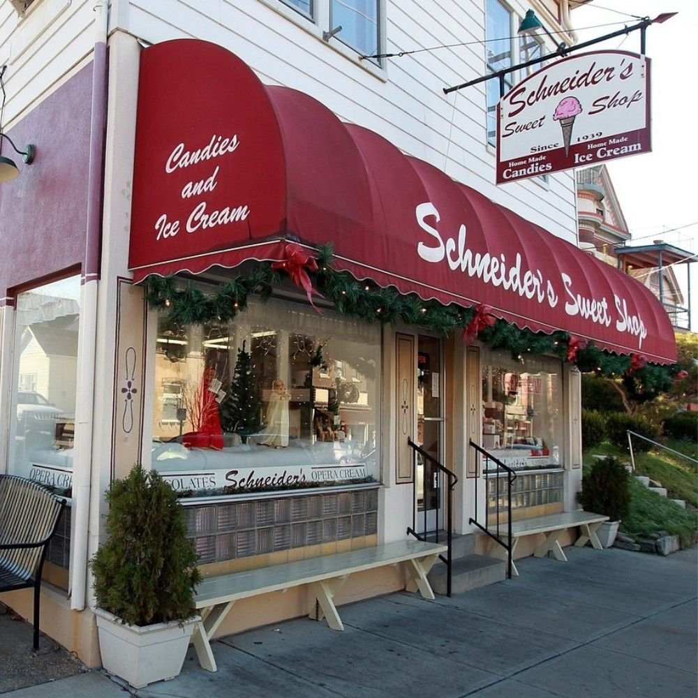 Schneider’s serves homemade candies, ice cream, floats, and famous “ice balls” in a nostalgic soda fountain.